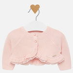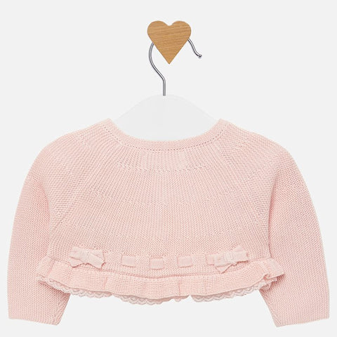 Cardigan à manches longues pour bébé fille nouveau-né. Col rond. Fermeture avec boutons. Tricot maille avec un toucher doux et agréable. Design avec tissu contrasté sur le bas du vêtement. Éléments décoratifs: dentelles, volant décors. Design uni.