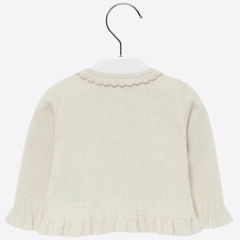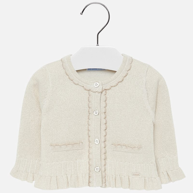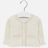 Cardigan à manches longues pour bébé fille. Col rond avec des détails contrastés. Tricot maille avec un toucher doux et agréable. Modèle avec plis plats. Design avec volant décoratif sur le bas du vêtement. Poches frontales décoratives simulées.