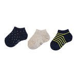 Ensemble pratique de trois paires de chaussettes à la cheville pour bébé garçon. Tissu 100% coton. Design avec imprimés, dessins et rayures.