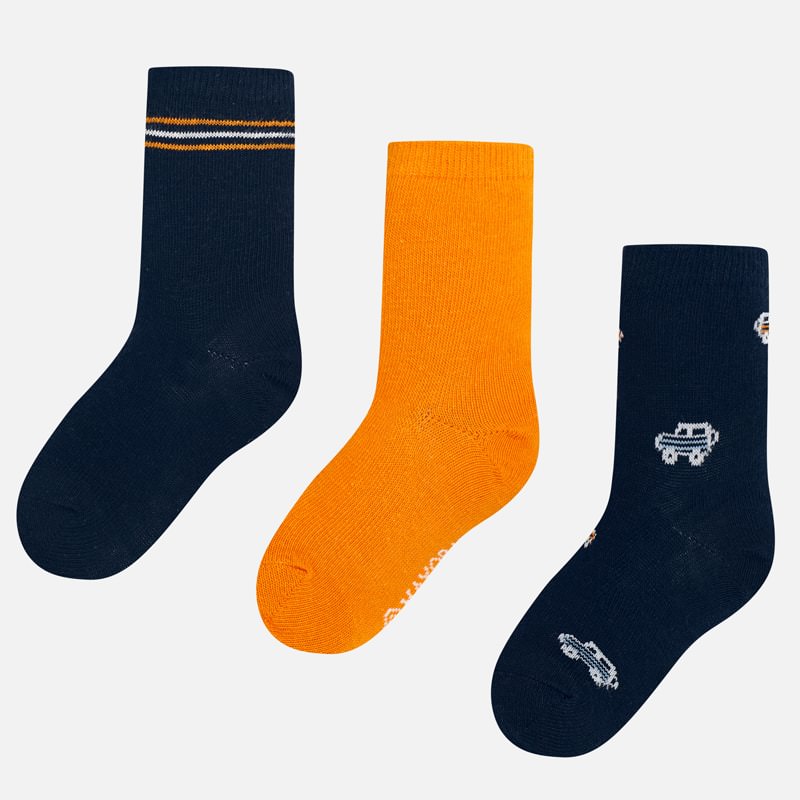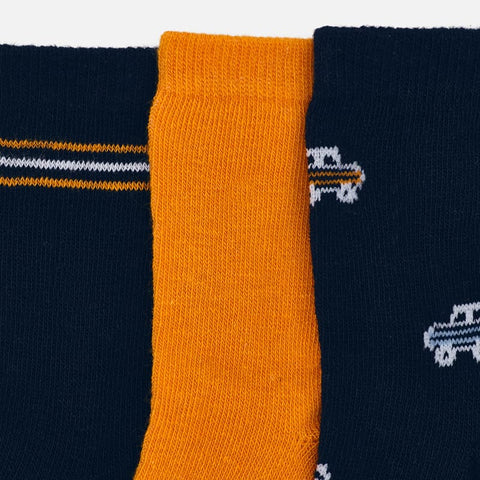 Ensemble pratique de trois paires de chaussettes pour garçon. Tissu doux en coton élastique. Éléments décoratifs: dessins décoratifs.