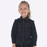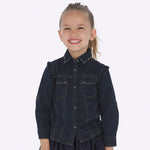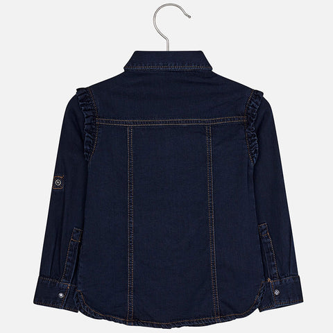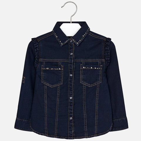 Chemisier à manches longues pour fille avec poignets boutonnés. Col chemise Fermeture avec des boutons sur le devant. Tissu 100% coton. Modèle avec volants. Poches fonctionnelles à l'avant. Éléments décoratifs: strass.