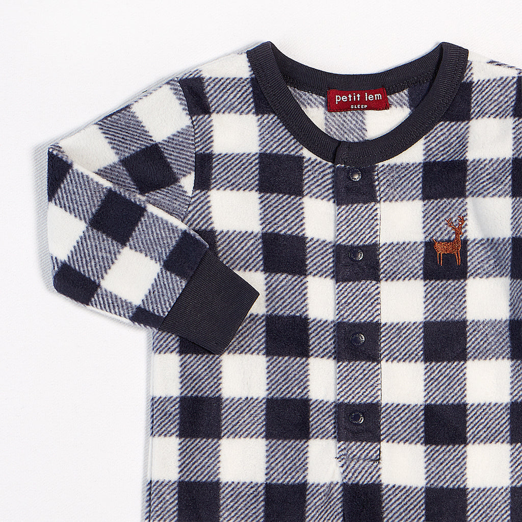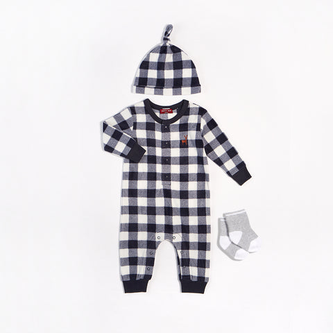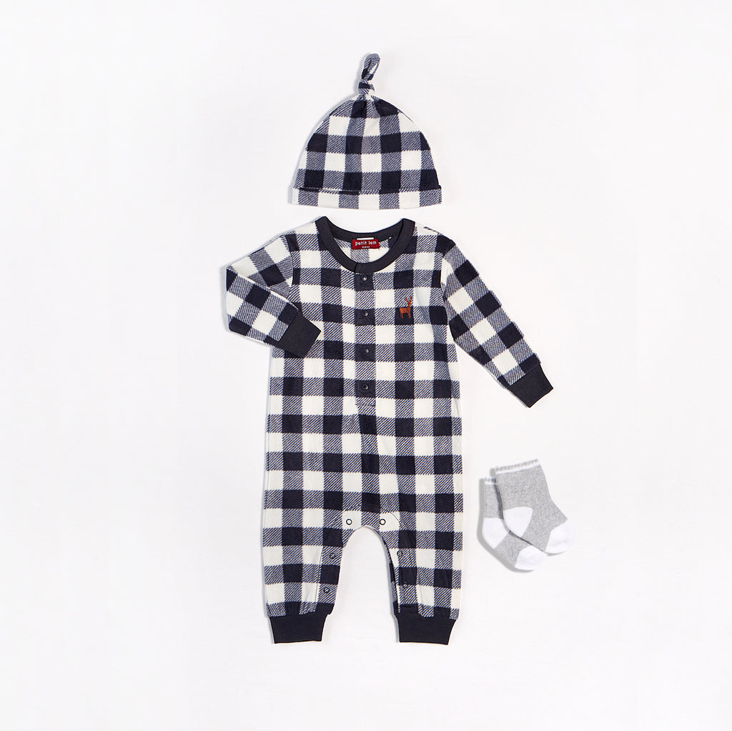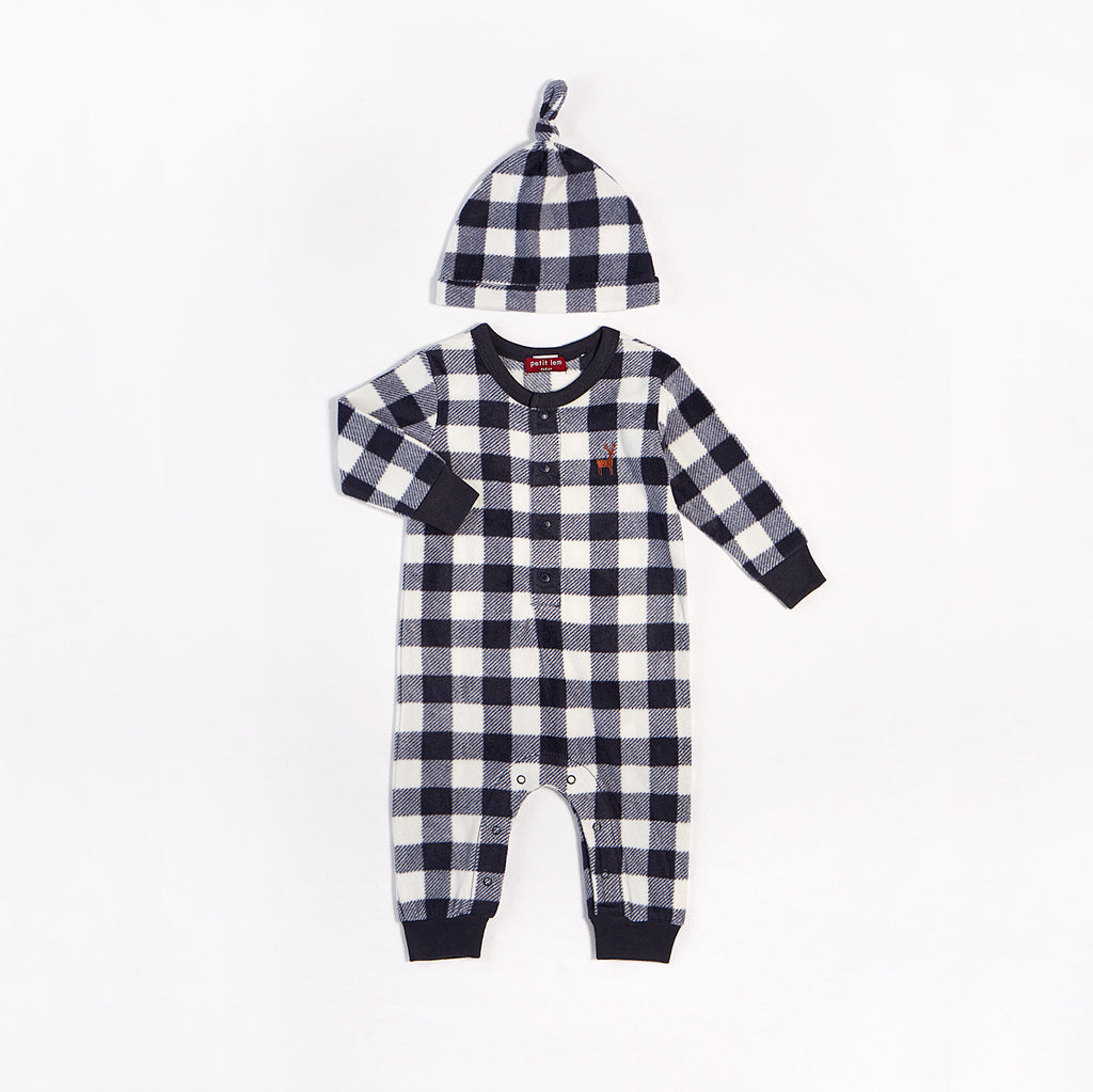 Une pièce carreauté marine et blanc hivernal  parfait pour vos tout-petits. L'ensemble de trois morceaux comprend le pyjamas une pièce, la tuque ainsi que les bas afin d'offrir le plus grand des conforts à vos minis.