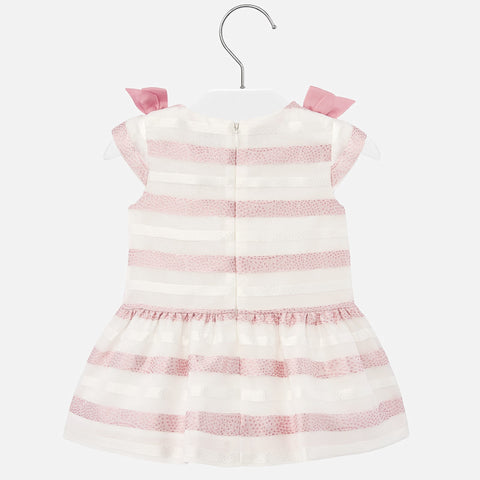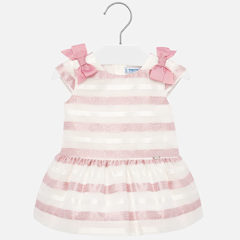 Robe à manches courtes pour bébé fille. Col rond. Coupe cintrée à la hanche. Ouverture arrière avec fermeture à glissière invisible. Tissu chaud, élégant et sophistiqué pour les occasions les plus spéciales. Modèle avec doublure intérieure. Éléments décoratifs: nœuds. Motif rayé. Modèle appartenant à notre ligne la plus élégante et exclusive conçue pour habiller les petits dans les occasions les plus spéciales.