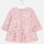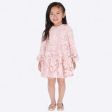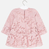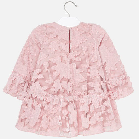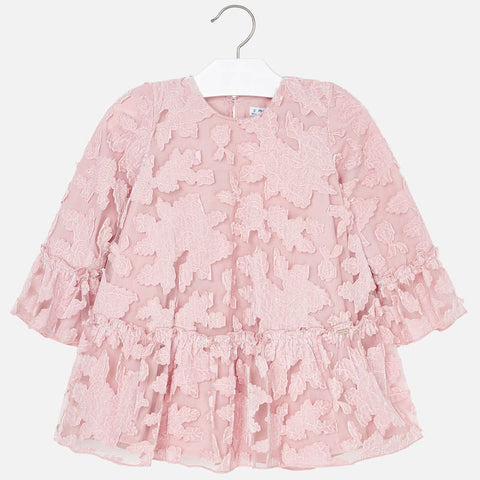 Robe à manches longues pour fille avec détails ton sur ton. Col rond. Petite ouverture dans le dos avec fermeture par bouton pour faciliter le passage du vêtement. Mélange de tissus soignés combinés pour un design unique et différent. Modèle avec doublure intérieure. Modèle bouclé avec volants. Motif floral.