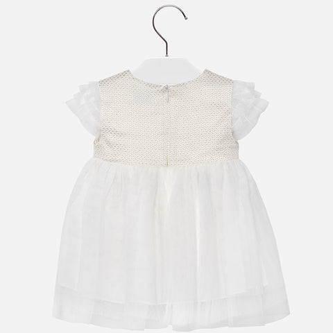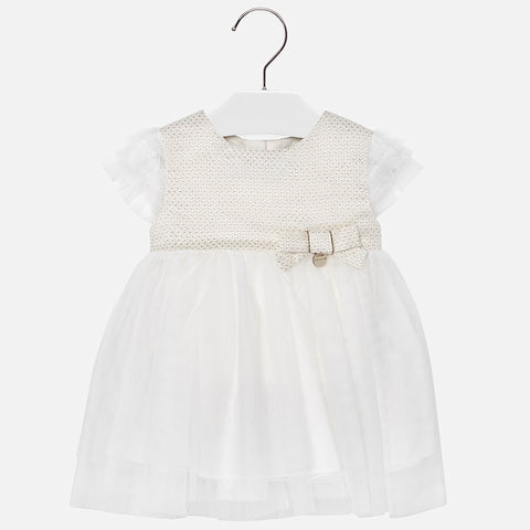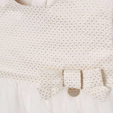 Robe à manches courtes avec des détails de volants pour bébé fille. Col rond. Coupe cintrée à la taille. Ouverture arrière avec fermeture à glissière invisible. Mélange de tissus soignés combinés pour un design unique et différent. Modèle avec doublure intérieure. Éléments décoratifs: nœud. Modèle appartenant à notre ligne la plus élégante et exclusive conçue pour habiller les petits dans les occasions les plus spéciales.
