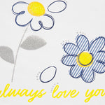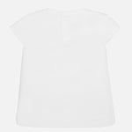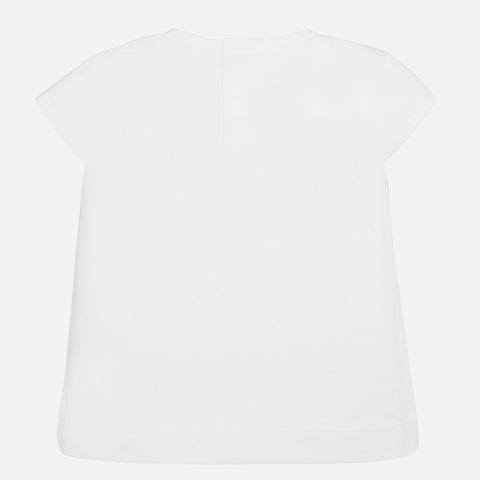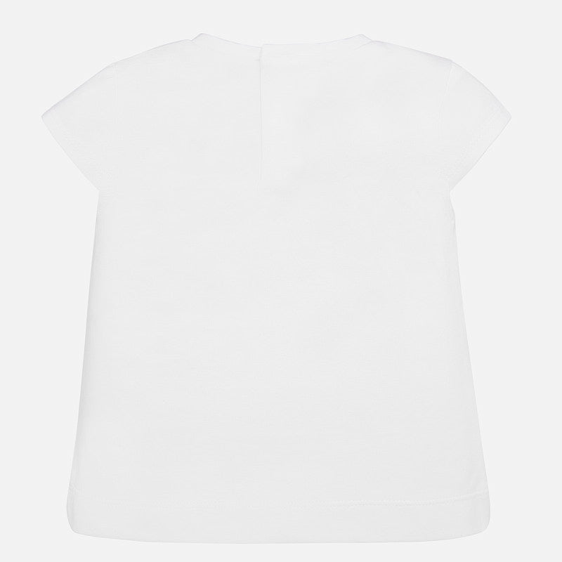 T-shirt à manches courtes pour bébé fille. Col rond. Fermeture à boutons-pression sur le dos pour faciliter le passage du vêtement. Tissu doux en coton élastique. Éléments décoratifs: dessin à l'avant, paillettes.